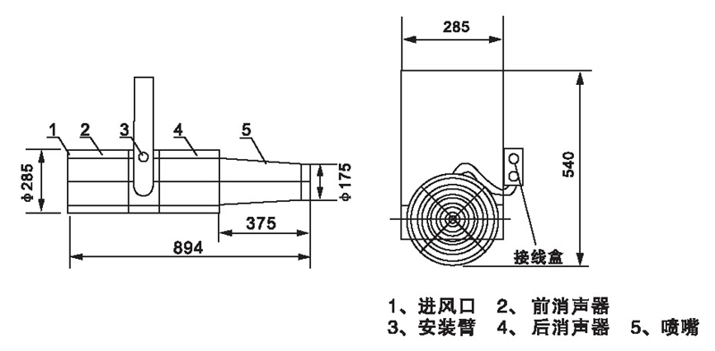 無箱軸流誘導風機由軸流風機、消聲器、噴嘴、固定架組成,回轉(zhuǎn)角度<60”,噴口φ175。