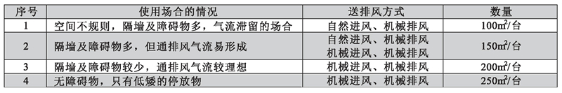 所需誘導風機的臺數(shù),在考慮通風方式(機械送排風,自然進風機械排風),有無隔墻,空間形狀的前提下,技每臺誘導風機所要承擔的面積計算,可參照下表確定:
