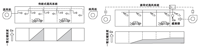 噴流誘導系統(tǒng)可設(shè)計智能系統(tǒng),在誘導空間內(nèi)設(shè)置空氣質(zhì)量傳感器,用以探測一氧化碳濃度,通過控制器自動控制誘導風機的開啟與停止(配置智能誘導風機),以實現(xiàn)自動化控制。